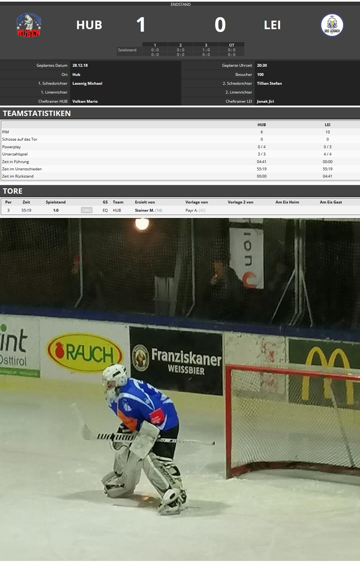 Zu einem Zeitpunkt, wo man eigentlich nicht mehr damit rechnen musste, fiel die Entscheidung in diesem Match in der Hubener Kunsteisarena. In der 56.Spielminute durfte Mathias Steiner nahezu in aller Ruhe das Leisacher Tor umkurven und konnte, da ein Adler-Verteidiger Deckung bot, Manuel Bachmann halbhoch an der kurzen Stange bezwingen.