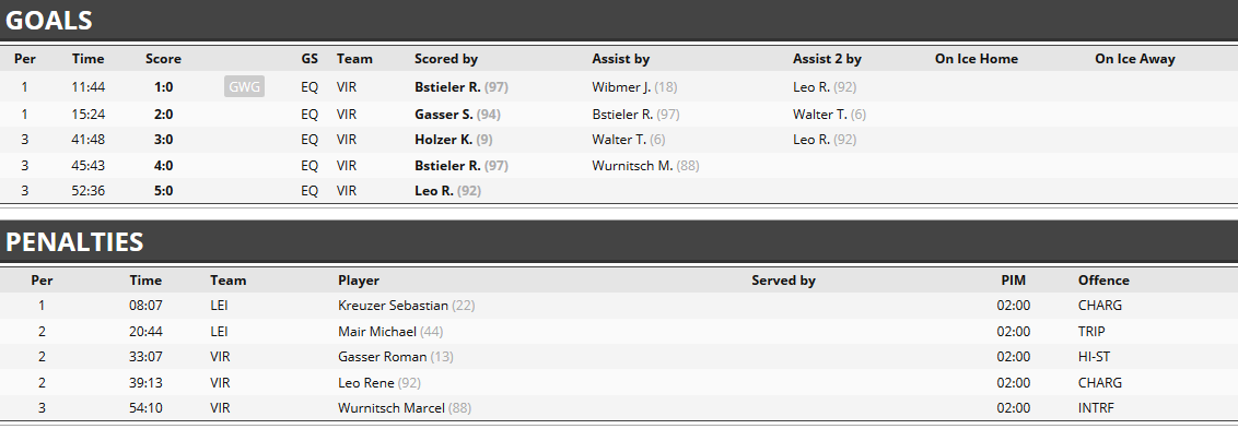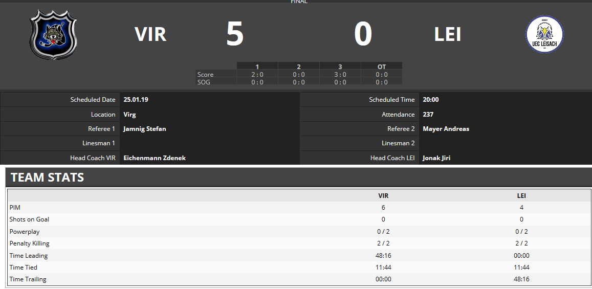 20190125_erste-in-virgen_ergebnisGar nur zwei Formationen/Linien standen den Adlern für, u.a. auf Grund des Hinspiels, absehbar schwierige Aufgaben im Rückspiel in der Virger Eisarena zur Verfügung. Die Ausgangslage vor diesem für die Adler vorletzten und für die Wölfe letzten Spiel im Grunddurchgang: Die Virger sind am zweiten Tabellenrang einzementiert und die Adler könnten mit einer Überraschung, die eigentlich niemand auf der Rechnung hatte, den Playoffeinzug vorzeitig fixieren.