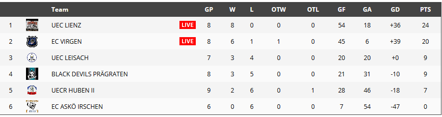 20190120_tabelle-ersteNichts für schwache Nerven bei diesem Spielstand sodann das Geschehen (fast ausschließlich im Adler-Verteidigungsdrittel) ab Spielzeit 59:38 in der Leisacher Natureisarena: Mit dieser Spielsekunde setzte es einen Strafausspruch für die Adler und mit 59:50  gesellten sich, nach einem Raufhandel, zwei Adler und drei Eisbären dazu. Die Schützlinge von Adler-Trainer Jiri Jonak konnten diese turbulenten Schlussszenen bestehen und somit sehr wichtige drei Tabellenpunkte einfahren.