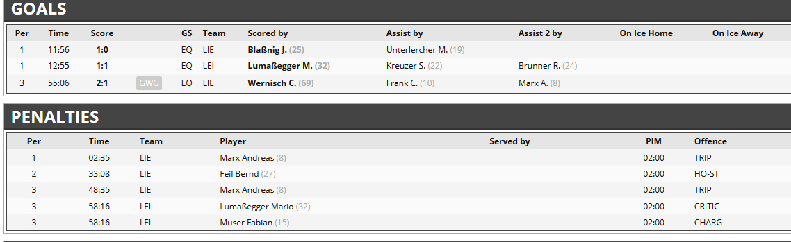 Auch in den abschließenden 20 Spielminuten ging es in der selben Tonart weiter. Der zur Zeit in Bestform agierende Adler-Goalie Manuel Bachmann hielt sein Team vor den nunmehr noch mehr anstürmenden, die Entscheidung suchenden Lienzer Löwen weiter im Spiel. Leisach versuchte sich weiterhin, aus den immer wieder vorhandenen Ansätzen zu einem Konter, auf den Führungstreffer. Das „Game-Winning-Goal“ fiel in der 56. Spielminute, jedoch zu Gunsten des UEC Lienz, den viele fix seit vorab der Meisterschaft bereits als Finalisten auf der Rechnung haben. Christian Wernisch enteilte im Stellungsspiel einem sichtlich ermüdeten, in Sachen Reichweite augenscheinlich unterlegenen Leisacher Flügel und stellte den Spielendstand her. Die Adler konnten in der verbleibenden Zeit nicht mehr nachlegen, zumal nach einem Geplänkel statt einem erwarteten Doppelausschluss sich plötzlich zwei Adler auf der Strafbank wiederfanden.
