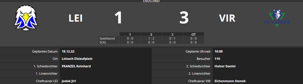 20221218_Virgen_EndstandDie zahlreich anwesenden Zuseher*innen sahen ein packendes Matchfinale. Die Adler drückten, teilweise sehr risikoreich, auf den Anschlusstreffer, leider vergebens. Auch die Goalie-Herausnahme war nicht hilfreich.