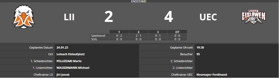 Das Farmteam der Leisacher Adler kassierte im ersten zu viele Strafbankaufenthalte, die die Zweiergarnitur der Lienzer Eislöwen zu den beiden, im Nachhinein wohl spielentscheidenden, Treffern im ersten Spieldrittel nutzten. Im zweiten Spieldrittel konnten die Adler durch die Treffer von Elias Senfter und Werner Neuschitzer ausgleichen. Weitere zwei Gegentreffer verhinderten einen Punktegewinn der nicht in Vollbesetzung agierenden Leisacher Cracks gegen den Tabellenzweiten.