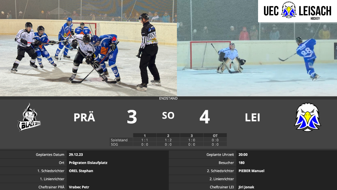 Nach dem sehr anstrengenden Match zwei Tage zuvor in Virgen und auf Grund von Ausfällen im Kader der Adler, stand für das Team von Trainer Jiri Jonak ein absehbar sehr fordernder Abend in der Prägratner Natureisarena an. Da der erste Gegentreffer (5. Min.) recht zeitnah egalisiert werden konnte (9. Min., Fabian Muser) und in der 26. Spielminute der Führungstreffer gelang (Raphael Senfter im Powerplay), war man sich auch in den Reihen der recht zahlreich mitgereisten Adler-Fans bewusst, dass hier und heute eine volle Punkteausbeute sehr wohl möglich ist. Leider gelang es den Adlern nicht in dieser Phase die Führung auszubauen, Chancen waren vorhanden. Sicher nicht hilfreich war, dass es im zweiten Spieldrittel zu sehr vielen Zweiminutenstrafen kam. In der 33. Spielminute erfolgte der Ausgleichstreffer der Black Devils, dem knapp drei Spielminuten später der neuerliche Adler-Führungstreffer (Markus Senfter) folgte. Gar nicht so wie in der zweiten Pause vorgegeben und besprochen, gelang den Adlern der Start in die letzten zwanzig Spielminuten der regulären Spielzeit: Phasenweise grob fahrlässig wurde im eigenen Verteidigungsdrittel agiert, Fehlpässe produziert, auch das Stellungsspiel zeigte Lücken. Und so kam wie es kommen musste, die Leisacher Cracks mussten den neuerlichen Ausgleichstreffer (50. Min.) hinnehmen.